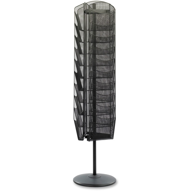 Rotating magazine stand offers 30 pockets to store magazines and other literature. Each 9-3/4 wide x 7-1/2 high compartment holds 5 lb. Three-sided rack rotates 360 degrees for total access to all literature. Ideal for a front office, reception area or a work area for keeping industry news close at hand. Made of steel mesh with powder-coat finish. Magazine stand includes wall-mounting hardware.