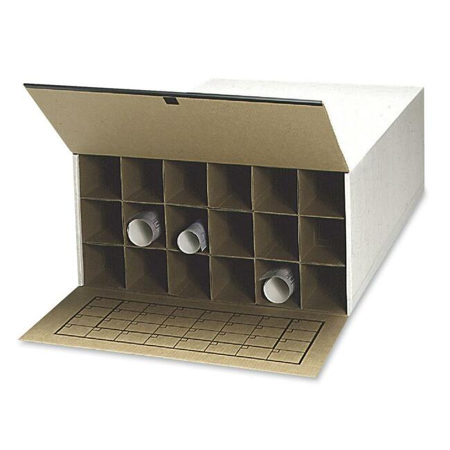 Use 18-compartment roll file to store multiple-size documents in the same file with built-in tube length adjuster tabs that extend to 24, 30, and 36. Each compartment measures 3-3/4 x 3-3/4. Labeling grid on inside front flap allows easy identification of contents. Stack roll files up to three high. Design features corrugated fiberboard with wood-side panels for extra strength.