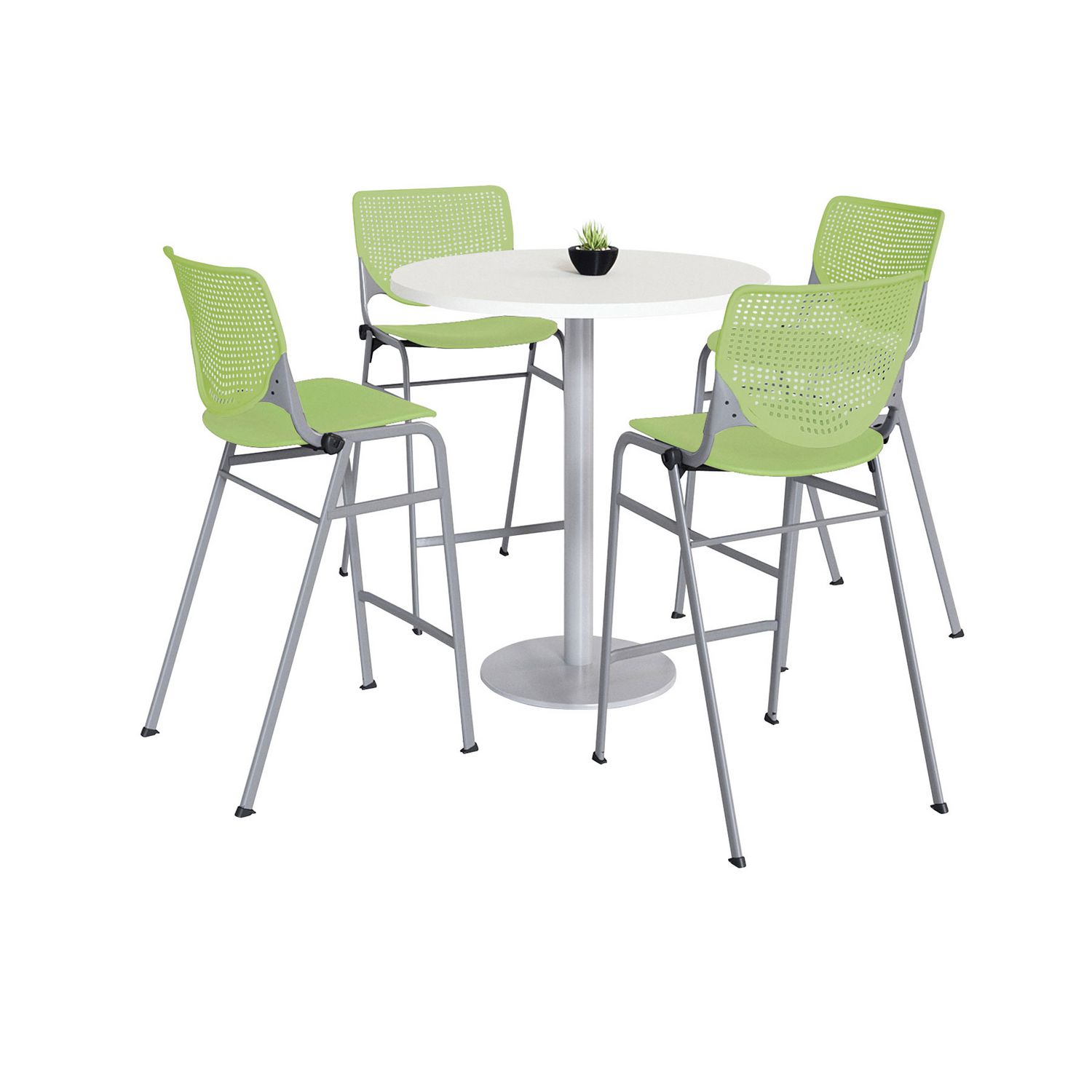 KFI Studios Pedestal Bistro Table with Four Lime Green Kool Series Barstools, Round, 36 Dia x 41h, Designer White